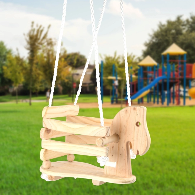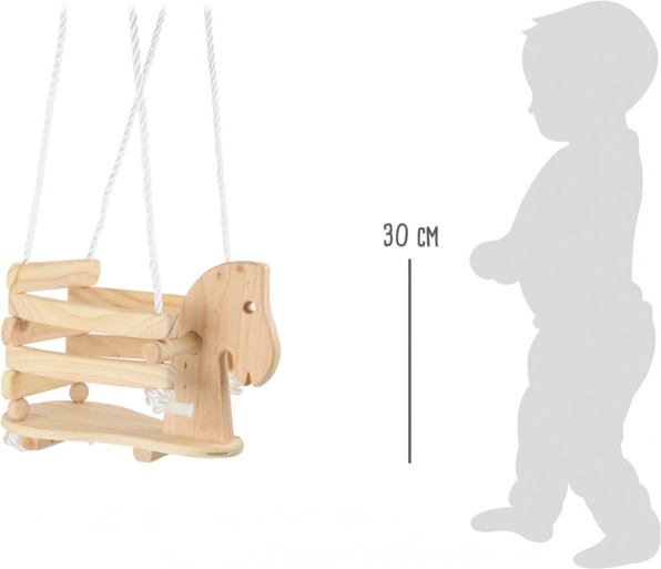 Hyha, fremad med gyngen! Denne børnegynge formet som en lille hest af massivt træ tilbyder sikker og behagelig siddekomfort takket være det rummelige sæde, ryglæn og forhøjet sikkerhedsafskærmning. Laterale håndtag for et fast greb, robuste nylonreb med metalringe og en maksimal belastning på 30 kg sikrer stabil og glædesfyldt leg både inde og ude.