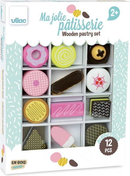 Giv små konditorer og kokke glæden ved leg med sættet af træsøde sager fra VILAC. De farverige kager og lækkerier ligner de ægte, passer perfekt i legekøkkenet og til købmandsleg og udvikler på fin vis både fantasi og finmotorik.