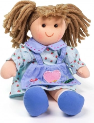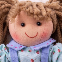 Klædt i blåt tøj med jordbærmotiv, er dukken Grace ikke kun sjov, men også en stilfuld legetøj.