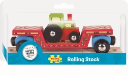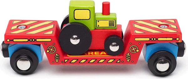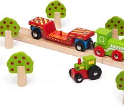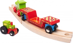 Dette farverige sæt bringer endnu mere fantasi ind i børnenes jernbaneunivers. Traktoren kan tages af vognen og bruges i leg på gården, eller lastes via lastefladen og sendes afsted på skinnerne. Takket være de magnetiske koblinger forbindes vognen hurtigt med lokomotiv og øvrige vogne, så udvidelse af den eksisterende togstamme klares på et øjeblik.