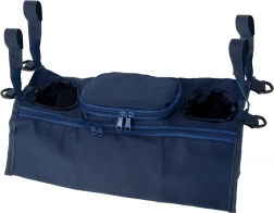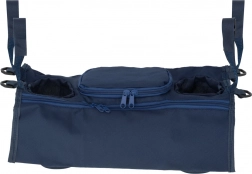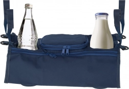 Praktisk barnevognsorganizer med to kopholdere, en rummelig lomme med lynlås og en mindre lomme med lynlås. Fastgøres nemt med velcobånd og holder alle nødvendigheder lige ved hånden – fra bleer og servietter til legetøj, telefon og sutteflaske eller drikkevare.