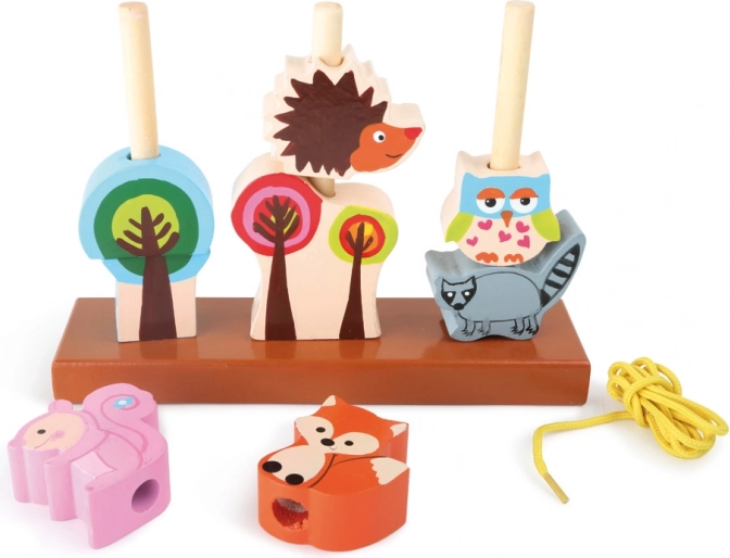 Dette kvalitets træsæt kombinerer stabling og trækning på snor i ét smart spil. Børn kan placere pindsvin, ræv, egern, vaskebjørn og ugle på et stativ med tre pinde eller trække dem på den medfølgende snor. Delene er robuste, ligger godt i små hænder og stimulerer fantasien med deres farver.