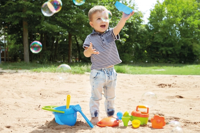 Farverigt plastiksandsæt med 10 dele til børn fra 2 år giver timevis af udendørs sjov og udvikler fantasien. Indeholder en stor spand med si, skovl, rive, vandkande og forme til at bygge slotte og “is”. Takket være plast af høj kvalitet og letgrebede håndtag er legen sikker og behagelig. Perfekt til sandkasse og strand, holdbart materiale og støtter finmotorikken.