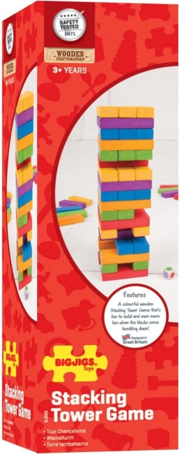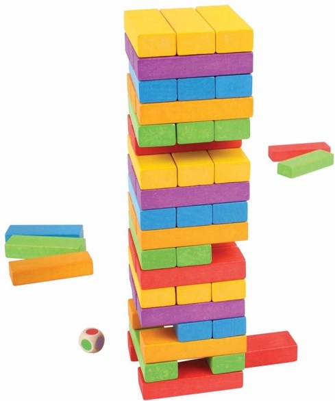 Et bygge- og færdighedsspil, der fanger hele familien. Slå med den farvede terning, træk den tilsvarende klods og læg den øverst – tårnet vokser, og spændingen gør det samme! Takket være den solide trækvalitet og de mættede farver er spillet holdbart, sikkert og flot at se på.