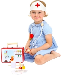 Børn vil elske den træ-lægekuffert, som styrker deres kreativitet og sociale færdigheder. Sættet giver en fantastisk mulighed for at lege doktor, hvilket hjælper med at udvikle barnets sproglige og sociale kompetencer.
