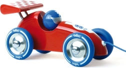 Stilfuld trækbar racerbil i lakeret træ i rød-blå kombination, der glæder små racerkørere fra 1 år. Den har gummibelagte metalhjul for stille og sikker kørsel, stærk snor til at trække i og kvalitetsarbejde fra VILAC. Ideel til at udvikle balance og koordination og til sjov både hjemme og på farten. Fremstillet i Frankrig.