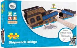 Bigjigs Rail skibsvrag-broen giver dit jernbanelandskab en eventyrlig atmosfære. De to solide dele samles nemt til en imponerende overkørsel eller gennemkørsel, så togene kan køre over og igennem det dekorerede vrag. Pirattemaet og havbølgerne inspirerer til kreative fortællinger og timevis af leg.