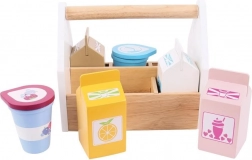 Denne robuste trækasse rummer fire drikkekartoner (mælk, appelsinjuice, jordbær- og chokoladeshake) plus et bæger yoghurt og fløde. Et ideelt supplement til børnekøkkenet og lege-butikken, som på en legende måde introducerer børn til grundlæggende sund ernæring og fødevarers oprindelse.