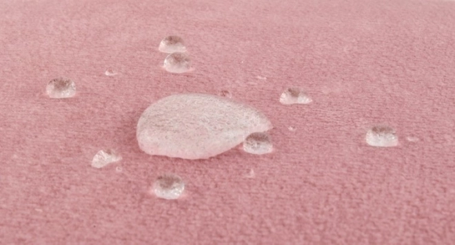 Fløjlsblødt CLEANABOO-materiale absorberer ikke straks væsker – spildte drikke forbliver som dråber og kan nemt tørres af.