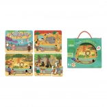 Træpuslespil med ZOO‑motiv giver sjov for børn fra 2 år. Indeholder fire puslespil, hver med seks brikker, og er praktisk opbevaret i en trææske med bomuldshank.