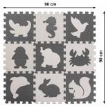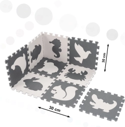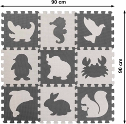 9 dele på 30 × 30 cm samles til en måtte på 85 × 85 cm. Delene kan kombineres, flyttes og hurtigt lægges på plads i den praktiske pose.