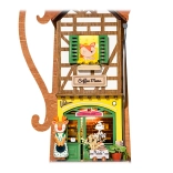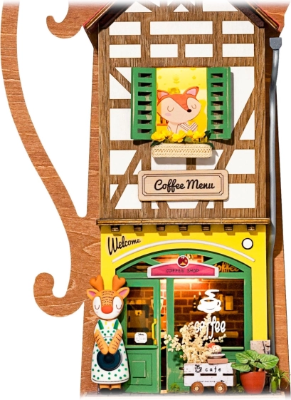 Pakken indeholder alt, hvad du behøver til monteringen, inklusive trædele, dekorationer, maling, lim, pensel og pincet. Belysningen er let at indstille og hurtigt at tage i brug via en kontakt. Mikro-batterier (2xAAA) er ikke inkluderet; leveres med en detaljeret vejledning.