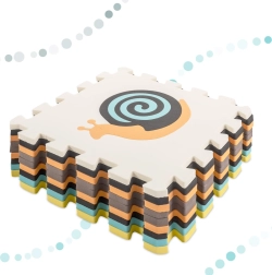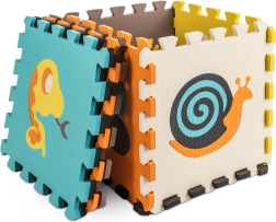 Denne store skummåtte består af 9 dele i størrelsen 30 × 30 × 1 cm, som nemt passer sammen. Kontrastfarver og søde dyremotiver fanger børns opmærksomhed og stimulerer syn og berøring. Udtagelige midterstykker fungerer som en enkel sorter – børn lærer at genkende former og placere dem det rette sted.
