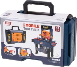Denne bærbare kuffert kan nemt foldes ud til et børnearbejdsbord med masser af opbevaringsplads – fra den nederste kasse til større dele, over den perforerede væg til værktøj, til to hylder og en rummelig bordplade. Børn lærer basis i gør-det-selv og kan sikkert afprøve aktiviteter som “skrue”, “hamre” eller “save”.