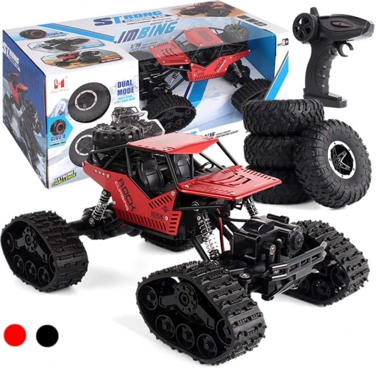 Terrængående RC-model 4x4 med mulighed for at skifte hjul til bælter klarer sten, sand og sne. Takket være 2,4 GHz, uafhængig affjedring og firehjulstræk får du præcis kontrol og fremragende trækkraft. Kørselstid op til 15 minutter, rækkevidde ca. 60 m og pistolgrebs-controller for komfortabel styring.