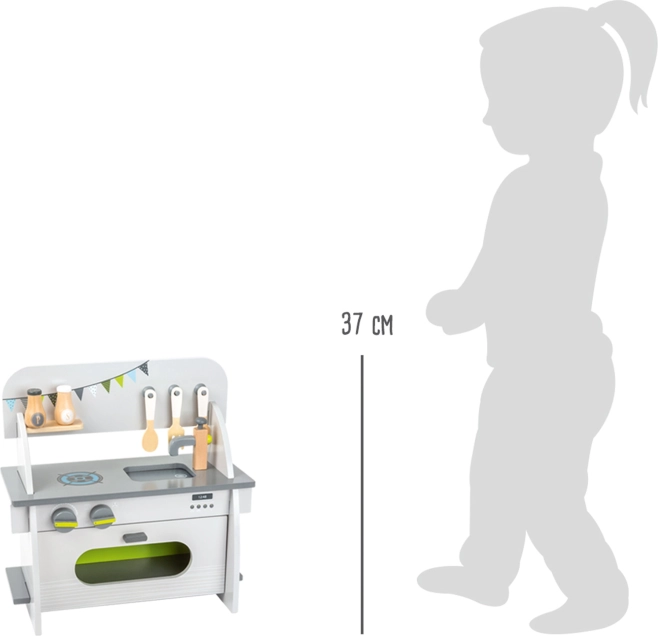 Køkkenet er fremstillet af 100% FSC-træ, så legen støtter bæredygtig skovdrift. Det elegante design i neutrale farver passer ind i enhver indretning, og takket være den enkle montage kan det nemt flyttes eller ryddes væk.