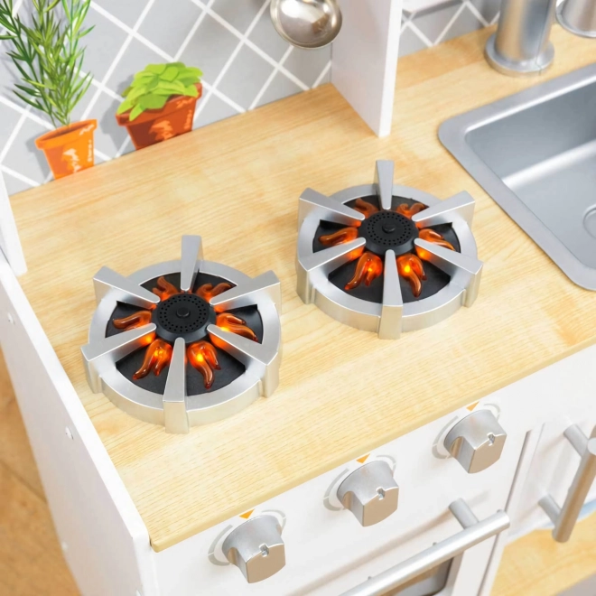 Børnene kan lave mad med lys- og lydeffekter på realistisk gengivet køkkenudstyr.