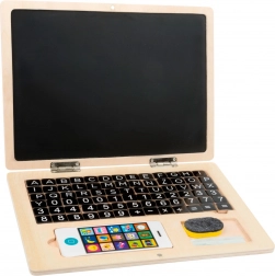 Denne træncomputer tilbyder en interaktiv og lærerig oplevelse for børn. Den er udstyret med bevægelige brikker med bogstaver, tal og symboler, der let kan flyttes på den magnetiske tavle, hvilket gør det muligt at danne forskellige ord eller løse matematiske opgaver. Derudover er der et kridtafdeling, hvor børn kan male og skrive og let kan viske alting ud ved hjælp af en svamp.