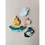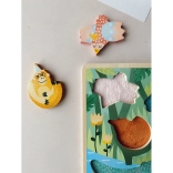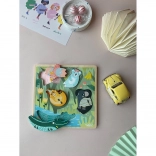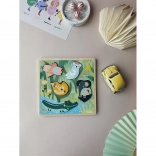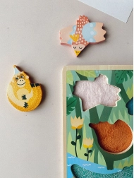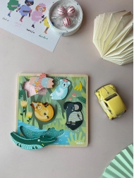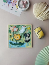 Designet af Michelle Carlslund i blide pastelfarver giver legetøjet et indbydende udtryk og stimulerer fantasien. Træbasen med udskæringer og dyremotiver lærer børn at matche former, genkende farver og dyr. Puslespillet er holdbart, sikkert og fremstillet af kvalitets træ kombineret med tekstil.
