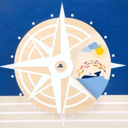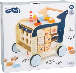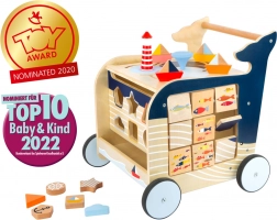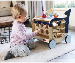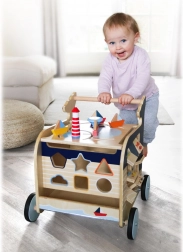 • Havverden: Gåvognen er inspireret af havets verden og indeholder aktiviteter som formindføring, billedrotation og en tegnetavle.