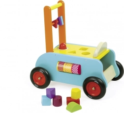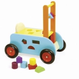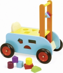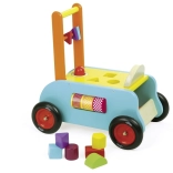 På siderne finder du udskæringer til indsætning af træformer, på venstre side roterende farvede valser, og under ryglænet farvede roterende trekanter. Sædefladen er udstyret med et horn med lydeffekter, som underholder børn og motiverer til yderligere opdagelser. Takket være den lave sædehøjde er vognen behagelig også for mindre børn.