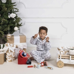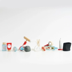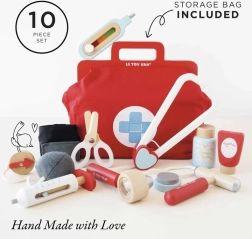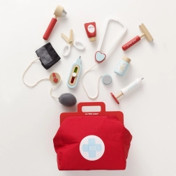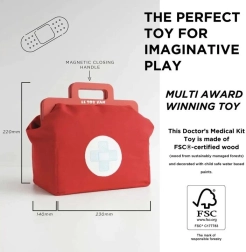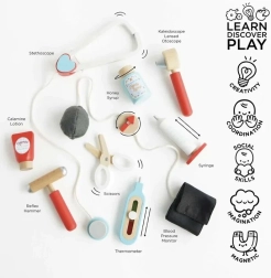 Stilfuldt doktorsæt til små læger i en tekstiltaske med træhåndtag, som bringer alt nødvendigt til rolleleg på klinikken. Indeholder i alt 10 dele, herunder stetoskop, termometer og injektionssprøjte. Legetøjet er kønsneutralt og understøtter finmotorik, fantasi og kognitive færdigheder. Fremstillet af bæredygtigt FSC-certificeret træ og håndmalet med ugiftige vandbaserede farver.