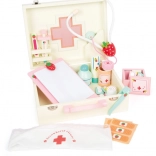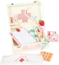 Takket være realistisk tilbehør som stetoskop, termometer, sprøjte, salver og medicin øver børn sociale færdigheder, empati og kommunikation. Holdbare materialer (træ, tekstil og papir) sikrer sikker og langvarig leg.