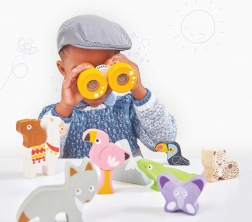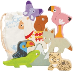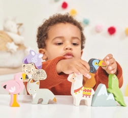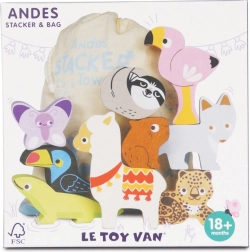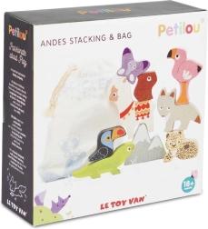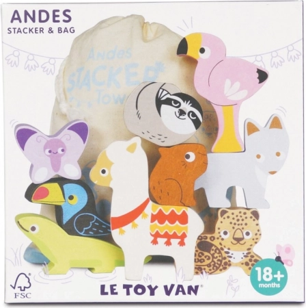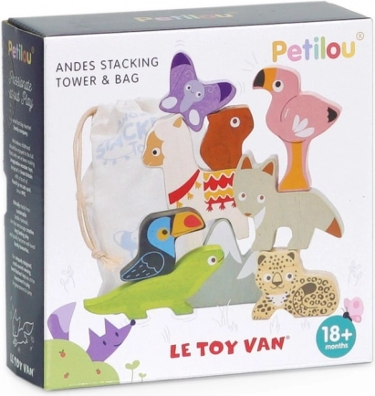 Dette andinske stablingstårn bringer bjergenes eventyr direkte ind på børneværelset. Sættet rummer robuste træfigurer af dyr (fx lama, flamingo, tukan, firben, sommerfugl, dovendyr) samt et bjergstykke, der kan stables, balanceres og kombineres i sjove opstillinger.