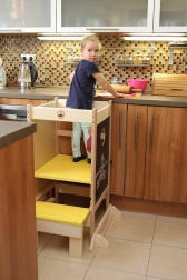 Den stabile trækonstruktion og rækværket omkring platformen gør det muligt for børn sikkert at nå arbejdsfladen og deltage i hverdagens gøremål.