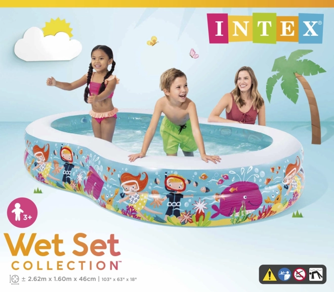 Pakkens indhold omfatter oppustelig pool, reparationssæt og farverig emballage.