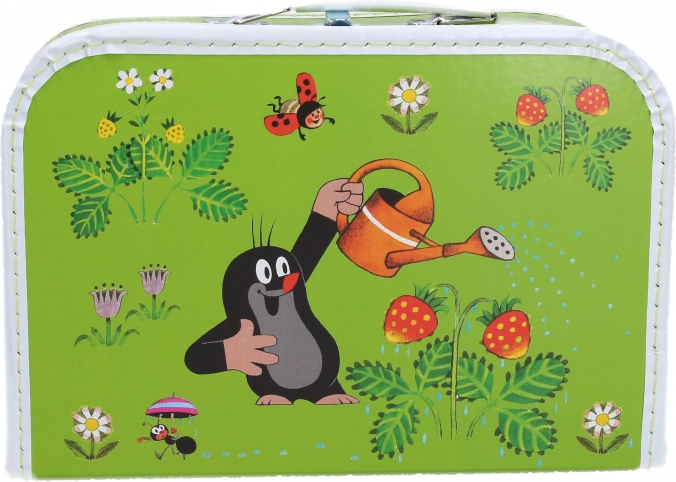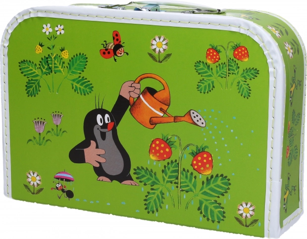 Den elskede eventyrfigur KRTEČEK nu som en sød gartner på den lysegrønne børnekuffert. Den praktiske størrelse på 30 cm og det glade, farverige design gør den til en fantastisk ledsager for små børn til opbevaring af småting til børnehaven og på ture.