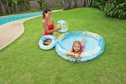 Sættet indeholder en oppustelig pool, badering og strandbold – børn kan bade, gribe bolden og øve sig i at føle sig trygge i vandet.