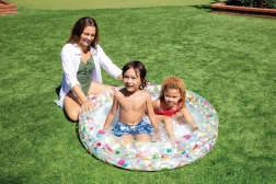 Denne runde børnepool på 122 × 25 cm er et fremragende valg til sommerleg i haven eller på terrassen. Takket være det lave vand (anbefalet højde op til 14 cm) giver den sikker og komfortabel afkøling for de mindste. Sættet inkluderer også en farvematchende strandbold og en børnebadering (begge ca. 51 cm), så underholdningen er sikret fra første opfyldning.