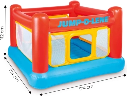 Giv børnene endeløs sjov med hoppeborgen INTEX Jump-O-Lene. Dette farverige oppustelige legehus er ideelt til børn fra 3 år og tilbyder sikker hoppen takket være netvægge, holdbart materiale og stabil konstruktion. Med målene 174 × 174 × 112 cm og en bæreevne på op til 54 kg er den perfekt til indendørs og udendørs brug.