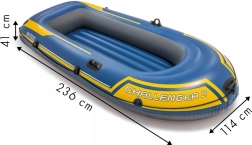 Den lette og holdbare oppustelige båd INTEX Challenger 2 er ideel til rekreative ture på roligt vand. Den rummer to personer, bæreevne 170 kg, 3 luftkamre for sikkerhed og en blød oppustelig bund for komfort. I pakken medfølger 2 lette årer, en håndbetjent stempelpumpe, åreholdere, fangline og et reparationssæt.