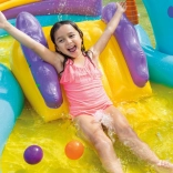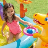 Det glade vandlegeland Intex Dinoland forvandler haven til et sted fuld af sommer sjov. Børn kan suse ned ad den oppustelige rutsjebane i soppebassinet, blive kølet af under vandspringvandet og lege med den oppustelige dinosaur med kastkurv. Den bløde landingsmåtte øger komfort og sikkerhed under legen.