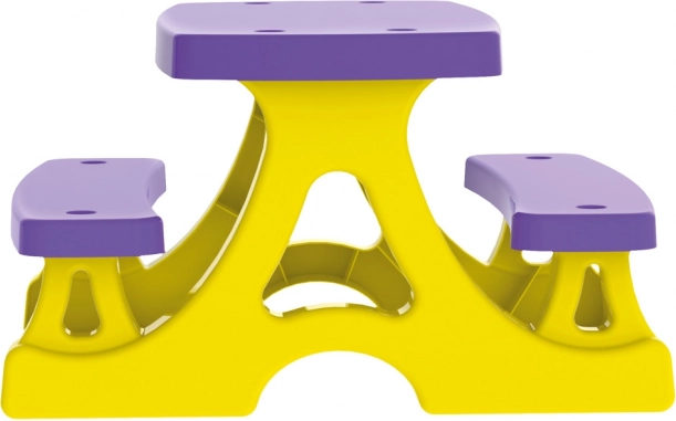 Kompakt picnicsæt i kvalitetsplast består af et bord og to bænke. Tilbyder et let og robust design, nem vedligeholdelse og målene 79 × 78 × 47 cm i en attraktiv gul‑lilla udførelse.