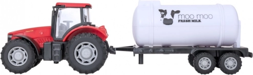Traktoren med hvid mælketankvogn efterligner landbrugsmaskiner troværdigt, så børnene let kan leve sig ind i rollen som små landmænd.
