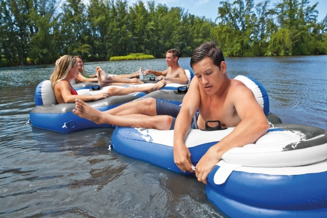 Fremstillet af forudtestet, kraftig vinyl. Omtrentlige mål 1,30 m x 1,26 m. Ikke legetøj, beregnet til rekreativ sport. Stærke håndtag. Nem at forbinde med andre River Run-produkter. To luftkamre, kopholder. Reparationslap medfølger.
