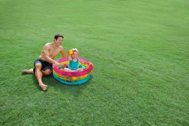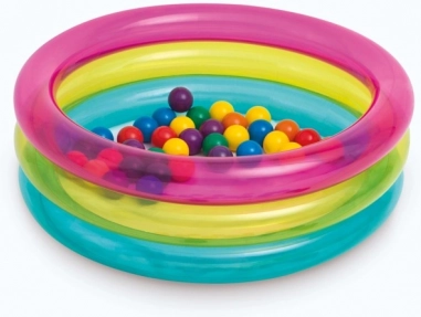 En sjov oppustelig boldpool fra INTEX forvandler ethvert børneværelse og have til en sikker legeplads. Gennemsigtige vægge med lyserød, gul og blå stribe. Holdbart PVC sikrer nem vedligeholdelse og lang levetid, ideel til børn 1–3 år.