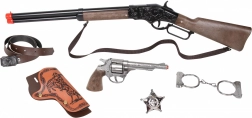 Forvandl børnenes leg i det vilde vesten til et realistisk eventyr. Dette store cowboysæt kombinerer klassisk udseende, sikker legetøjsudførelse og kvalitetsmaterialer. Metalriffel og -revolver til knaldhætter (8-skuds bånd) giver lydeffekter, som børn elsker, mens håndjern og sherifstjerne fuldender outfittet.