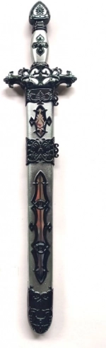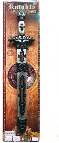Sværdet har en detaljeret udformning, der efterligner autentiske riddervåben.