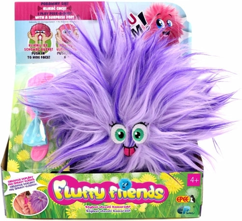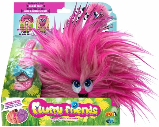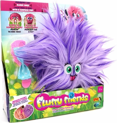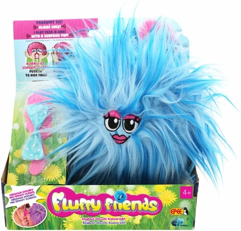 FLUFFY FRIENDS er den ideelle ven til både kram og leg. Den bløde, fyldige pels er dejlig at røre ved, og det søde ansigt med store øjne vinder straks børns hjerter. Den sjove pop-effekt får ansigtet til at gemme sig ved et tryk og kigge frem igen – masser af overraskede smil i vente.
