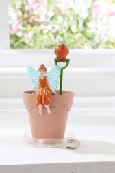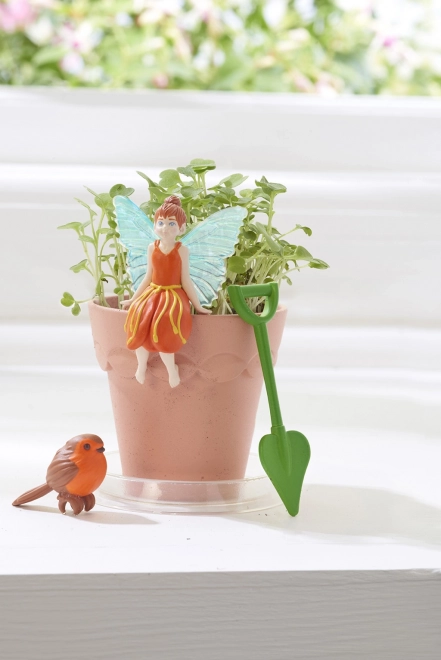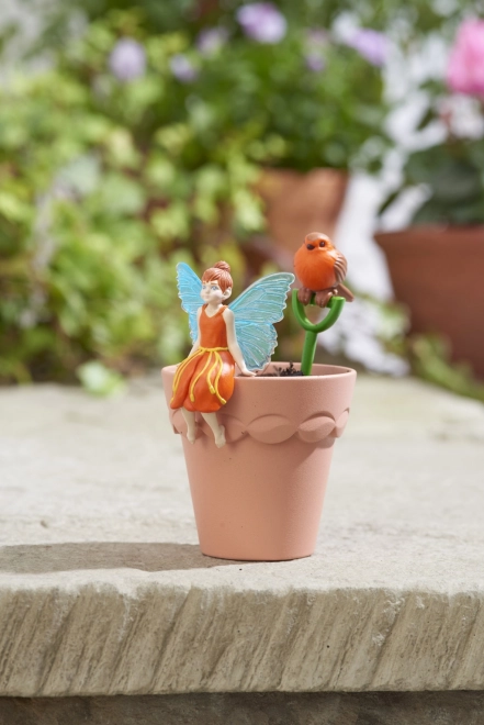 Den charmerende fefigur med blå vinger og vennen fuglen Robin giver urtepotten et eventyrligt udtryk og lyser op på børneværelset.