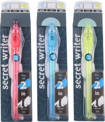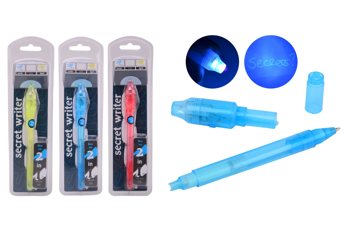 Med denne pen kan du skrive usynlige beskeder, som kun kan ses under ultraviolet lys. Pennen med usynligt blæk har sådan et lys i hætten. Denne pen er en fantastisk gave til børn, men også til dine venner. Ingen kan se, hvad du skriver med denne pen, men så snart du kommer på diskotek, bliver alt afsløret. Nogle bruger også denne pen til at skrive snydeark, men du kan for eksempel bruge den til en kærlighedsbesked! 3 typer.