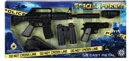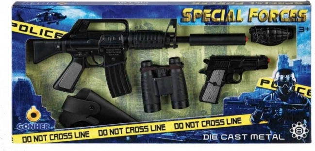Gå i aktion med specialenhederne med et kvalitets politisæt i robust metal. Den realistiske udførelse og knaldhætte-"skud" med kapacitet på 8 skud giver en autentisk oplevelse til hver mission. Perfekt til rolleleg og fantasiudvikling.