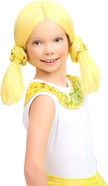 Den gule Lollipopz-paryk er et fantastisk tilbehør til fans af den populære børnegruppe Lollipopz. Takket være den strålende farve og den kvalitetssikre udførelse bliver den et iøjnefaldende element i ethvert outfit – fra fastelavn og koncerter til temafester.
