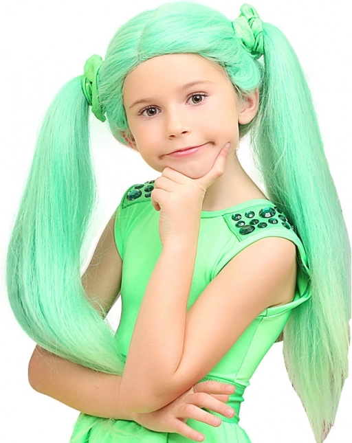 Stilfuld børneparyk inspireret af gruppen Lollipopz med en markant grøn farve og to hestehaler. Fremstillet af kvalitetssynthår, behagelig at have på, universel størrelse og ideel til fastelavn, koncerter og fester.