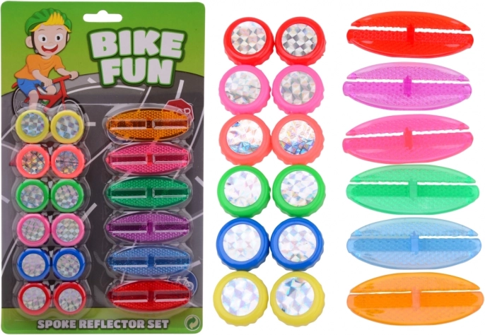 Sæt med farverigt cykeltilbehør: 12 dekorationsringe og 6 reflekser for stil og synlighed. Nem montering, let plast. Pakke 16 × 26 cm.