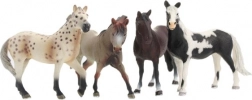 Fire plastfigurer af heste, hver i en anden farve, hvilket gør det muligt for børn at skabe forskellige scener og historier.